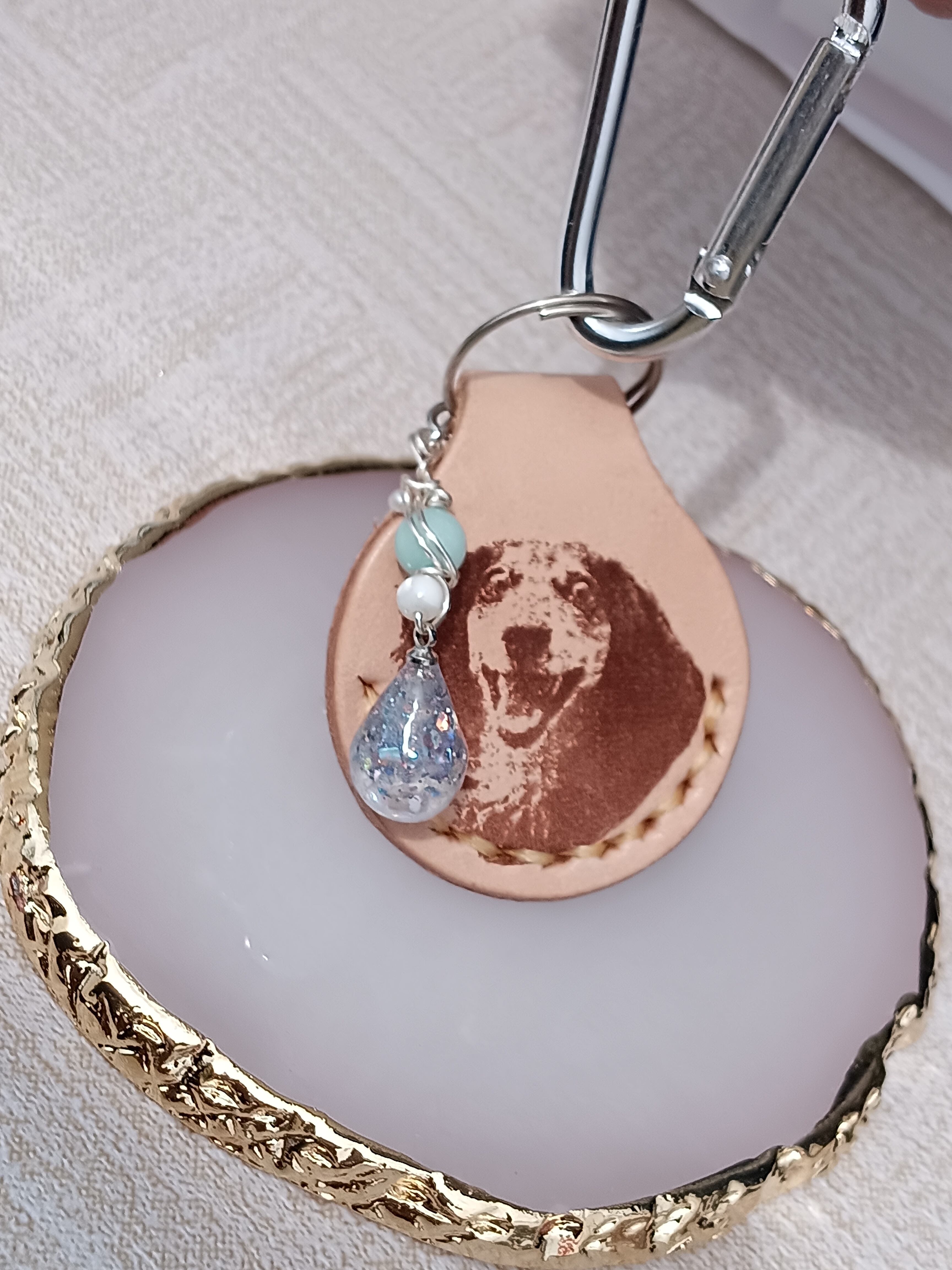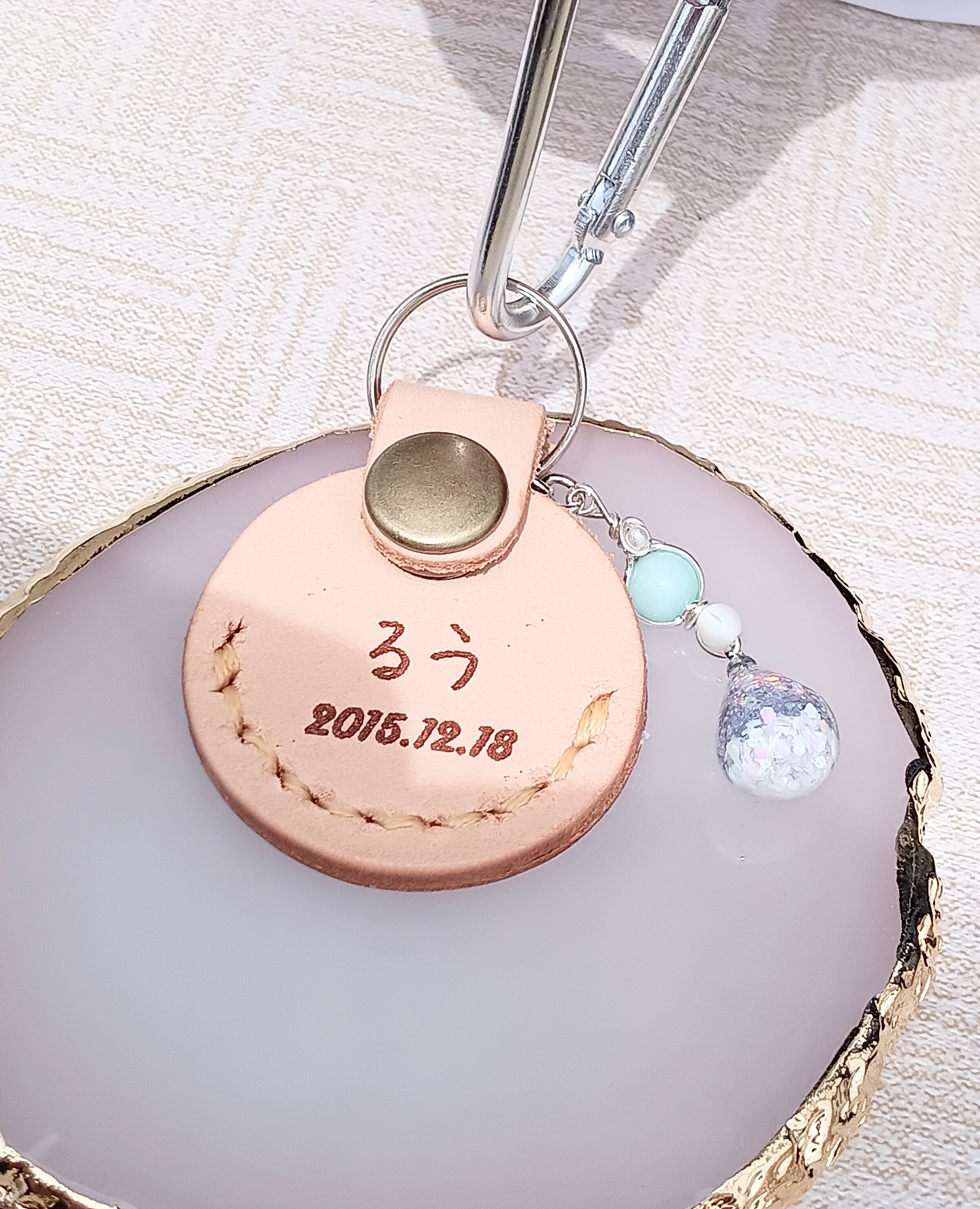レザーに可愛いお写真と裏面に焼印の文字をいれられます。
